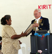 The Rotary Club of Kiritimati Governor Jack Davies of District 9220 presents the Rotary Club of Kiritimati charter certificate to club president Ruta Uatioa. Photo by Sharon Maybee Members of the first Rotary club in the island nation of Kiribati spent a week in August celebrating its charter. On 11 August, RI General Secretary Ed Futa, on behalf of the RI Board, approved a charter for the Rotary Club of Kiritimati, Line Islands, Republic of Kiribati, adding another nation to the more than 200 countries and geographical areas on the Rotary map. "Rotary will have an important and positive impact on improving the lives of people in Kiritimati (formerly Christmas Island)," says club president Ruta Uatioa. "Rotary represents leadership, something we are excited to adopt here." The 35-member club, along with guest Rotarians from District 9920 and the United States, held its first official club meeting on 23 August, the kickoff to the weeklong festivities. As part of the week's programming, Kiritimati club members visited schools and hospitals to assess potential projects. Participating in the activities were members of the Rotary Club of Commerce City, Colorado, USA, who led multiple World Community Service (WCS) projects on Kiritimati and were instrumental in introducing Rotary to the islands. George Maybee, a member of the Commerce City club, has vacationed with his wife, Sharon, on the island for years. During a trip in 2006, Maybee became convinced his club should get involved with helping people there. A year later, the club launched a multiphase WCS project consisting of improved medical care, water quality, and educational opportunities. The club then joined efforts with Past District 9220 Governor Warwick Pleass, who was already working with RI to get a club chartered in Kiribati. Maybee and members from the Rotary Club of Suva East, Fiji, made several trips to Kiritimati to help a provisional club. Island nation Kiribati (pronounced KEER-ah-bhass) consists of 33 islands scattered across 2,400 miles of the Pacific Ocean, with a population of more than 105,000. The three main groupings are the Gilbert Islands, Phoenix Islands, and Line Islands. In 1995, Kiribati drew international attention when it petitioned to change the International Date Line, which divided the nation into two time zones. The entire nation now lies west of the date line, which zigzags around the easternmost islands. Kiribati gets a large portion of its income from overseas, including fishing licenses, development assistance, and tourism. "Our people are used to being on the receiving end of help," says Uatioa. "With the first Rotary club here, our members can now be on the giving end." Projects in the works for the Kiritimati club include completion of upgrades to the Banana Village Medical Clinic; construction of working toilets for all six schools on the island; distribution of dictionaries provided by the Rotary Club of Brighton Early, Colorado; and distribution of toothbrushes and toothpaste. "The future is bright; Rotary