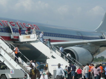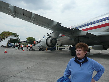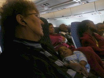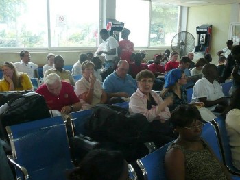 Above: Sunday, A weary but happy D-7150 & D-7020 team checking in at the Jeremie airport, prior to flying back to Port au Prince on the small propeller plane. After a crowded terminal check-in, a late arriving plane, and a long walk down the tarmac, the plane to carry us back to our respective homes in The Bahamas (Dick), Florida (Brad), and New York (Marlene & Earl) departed Haiti. My last act of Haiti kindness, for now, holding a Haitien baby on the airplane to NY so her Mom could take a break. View slideshow of flight from Jeremie, Haiti airport back to Port au Prince airport for final leg home. Monday all day was spent