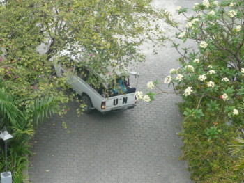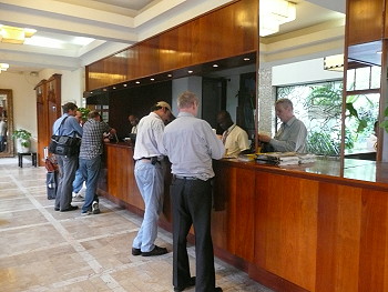 Above: Checking in at Hotel Montana in Port au Prince, which is guarded by U.N. armed troops and local police. The main Capital City has no power much of the time. All big businesses have generators that they run more often than not, importing water by the tanker. View slideshow of Hotel Montana in Port au Prince, Haiti.