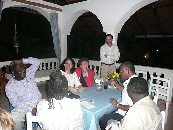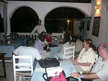 Above: The entire team traveled over rough roads in a four-wheeler to a private bar a half hour away. There we enjoyed an evening of local talent and fun. The band from Port au Prince that was due to play did not arrive so Haitien Rotarians improvised by singing, telling stories, and reciting poetry. Despite shortcomings in development, Haiti has the basics of true social art and culture. View slideshow of this enjoyable evening.